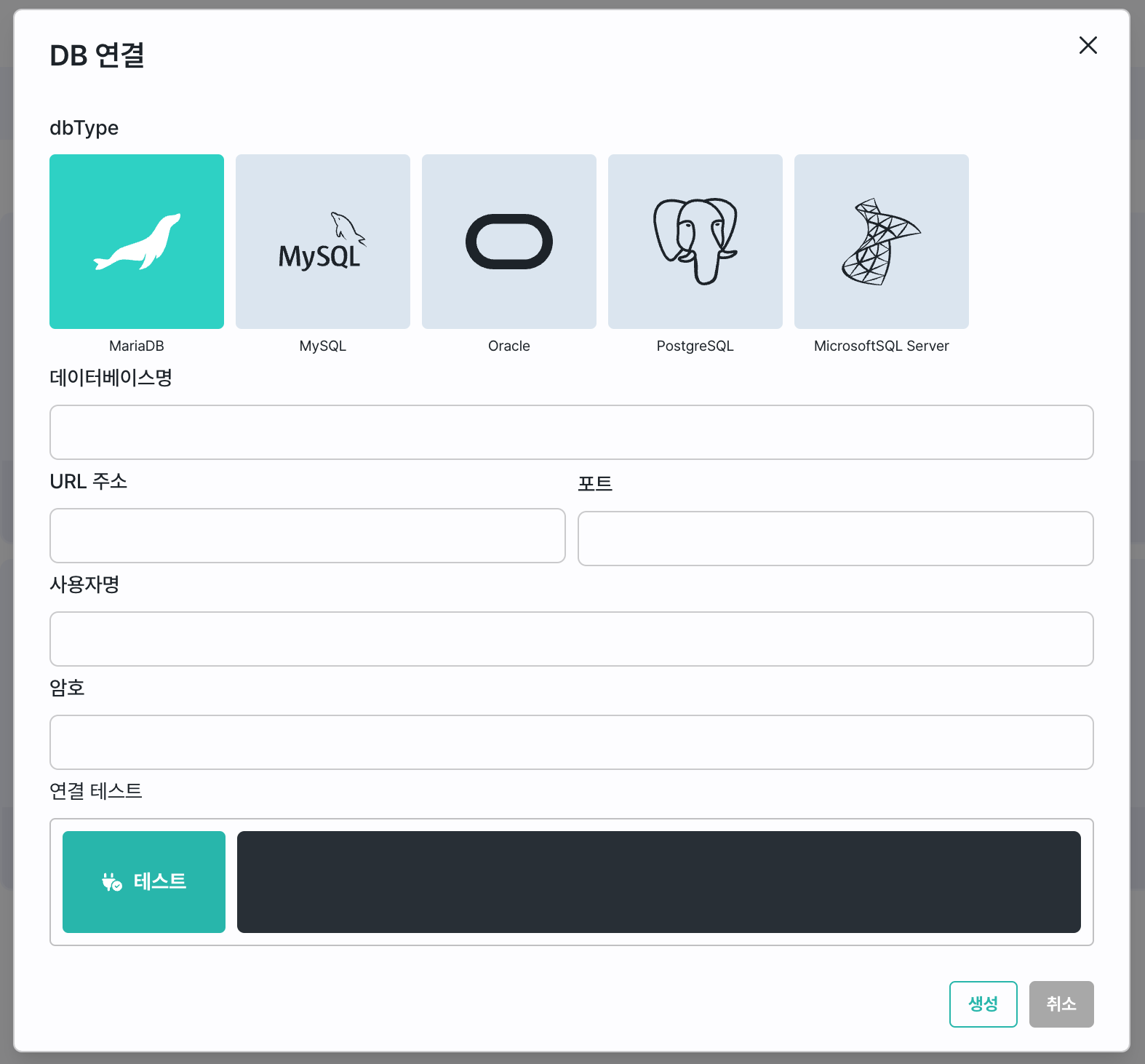 | dbType | 연결할 데이터베이스 타입입니다. (MariaDb, MySQL, Oracle, PostgreSQL, MicrosoftSQL Server) |