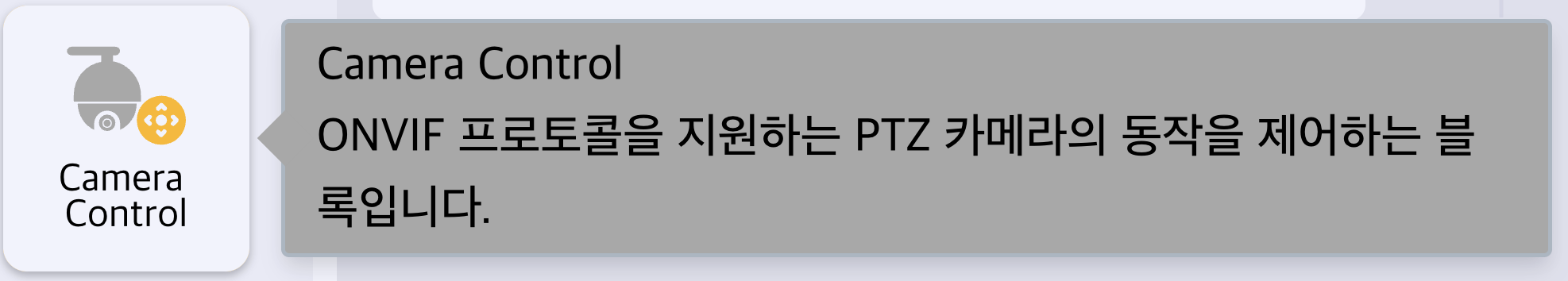 Camera Control 블록은 ONVIF 프로토콜을 지원하는 PTZ 카메라의 동작을 제어하는 블록입니다. 카메라에 저장된 **프리셋(preset)**을 변경할 수 있으며, 블록 상단의 수정 버튼을 눌러 설정할 수 있습니다.
