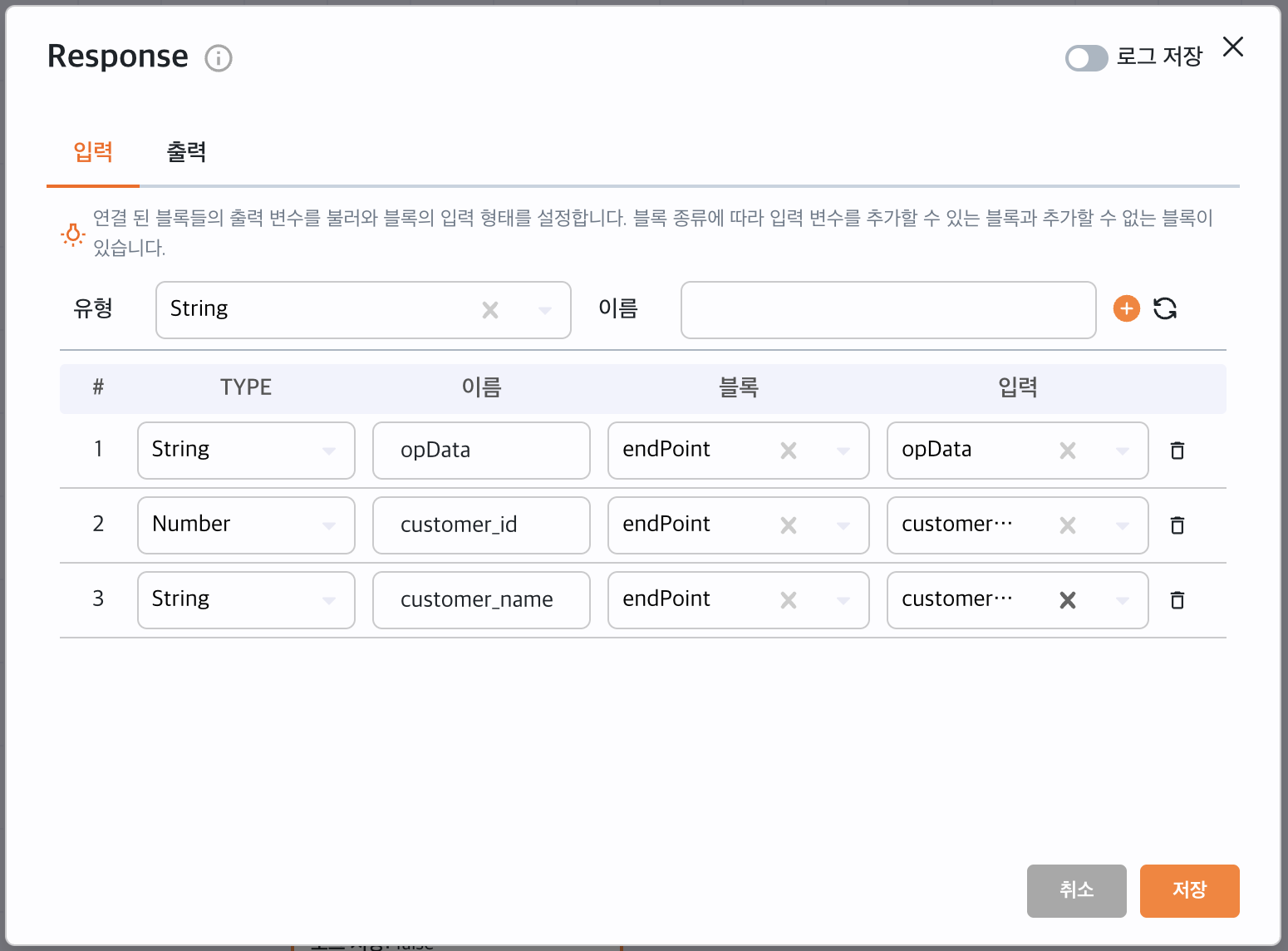 Response 블록은 EndPoint 블록의 출력값을 그대로 응답으로 반환하는 역할만 수행하므로, 별도의 설정이 필요하지 않습니다.