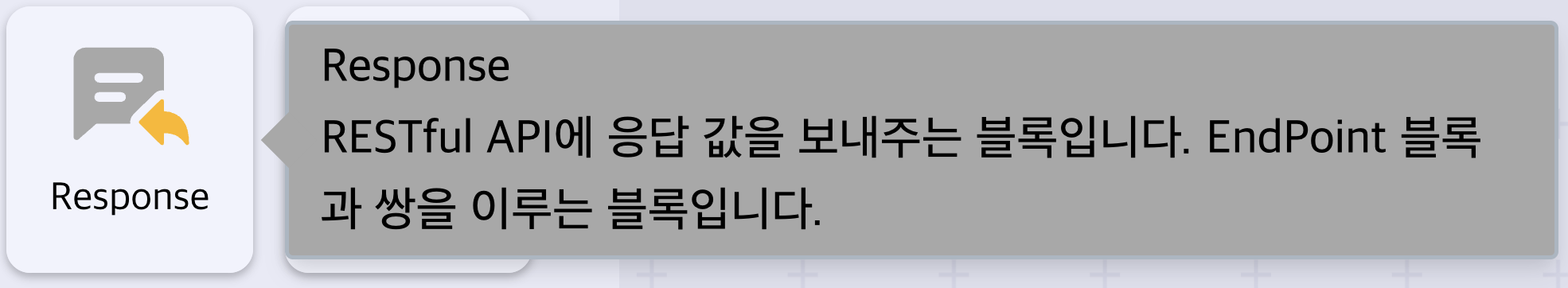 Response 블록은 RESTful API에 응답 값을 반환하는 블록으로, EndPoint 블록과 반드시 함께 사용해야 합니다. EndPoint 블록이 데이터를 수신한 후 해당 데이터를 가공 없이 그대로 반환할 때 Response 블록을 사용합니다.